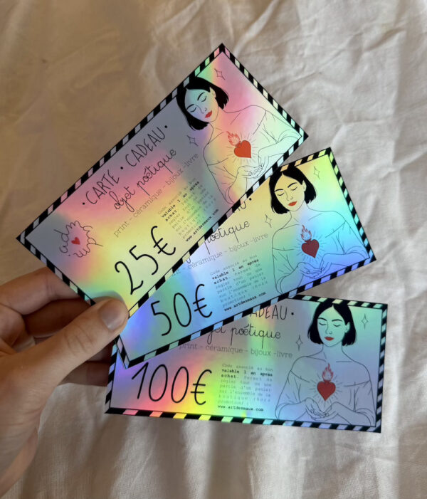Il existe en version digitale (le code promo sera unique et envoyé par mail une fois l’achat réalisé) ou bien en physique ( 5€ en plus de la somme du bon ), avec l’envoi de la carte imprimée & le code promo sur papier holographique cartonné – pour un meilleur cadeau à glisser sous le sapin hihi.