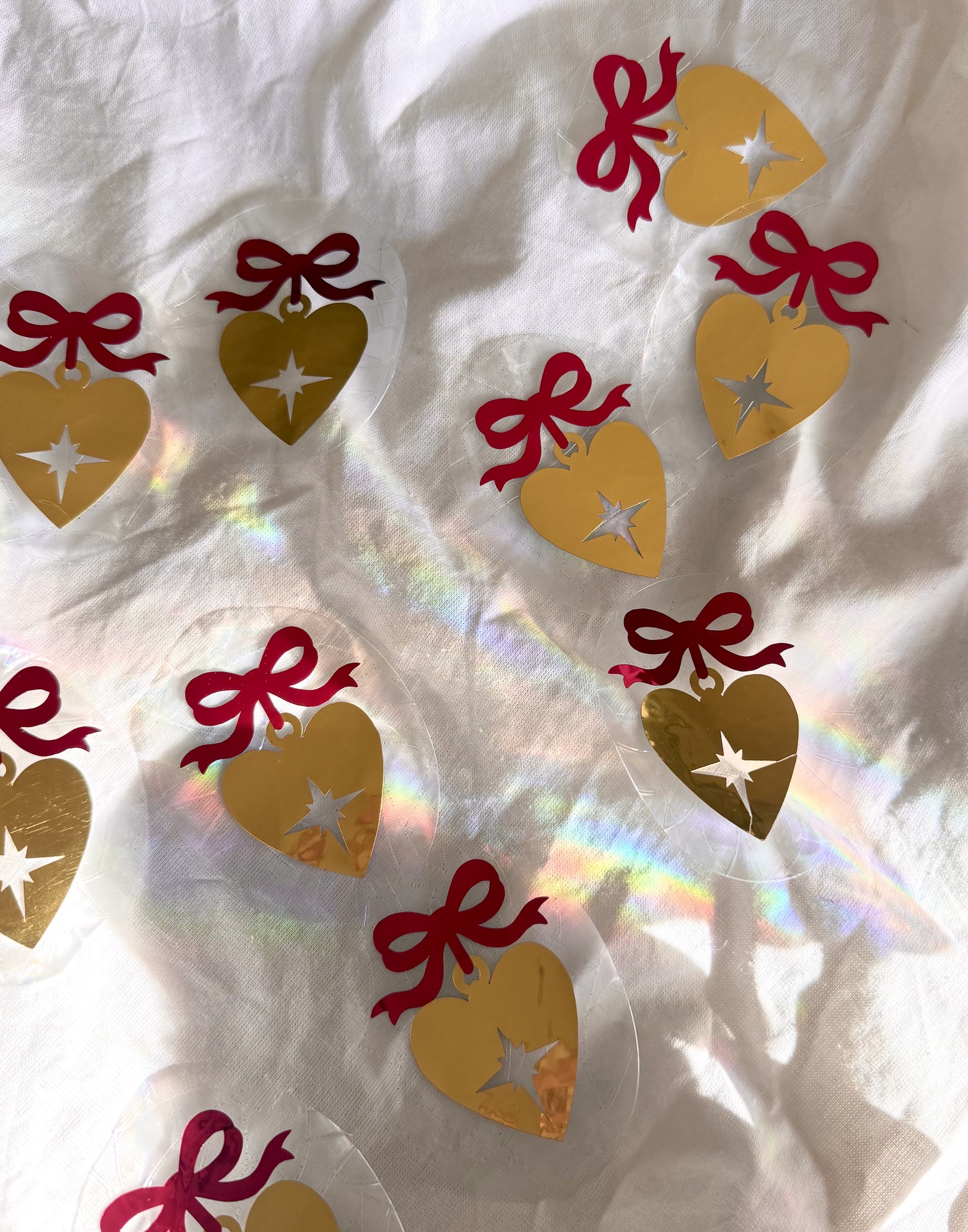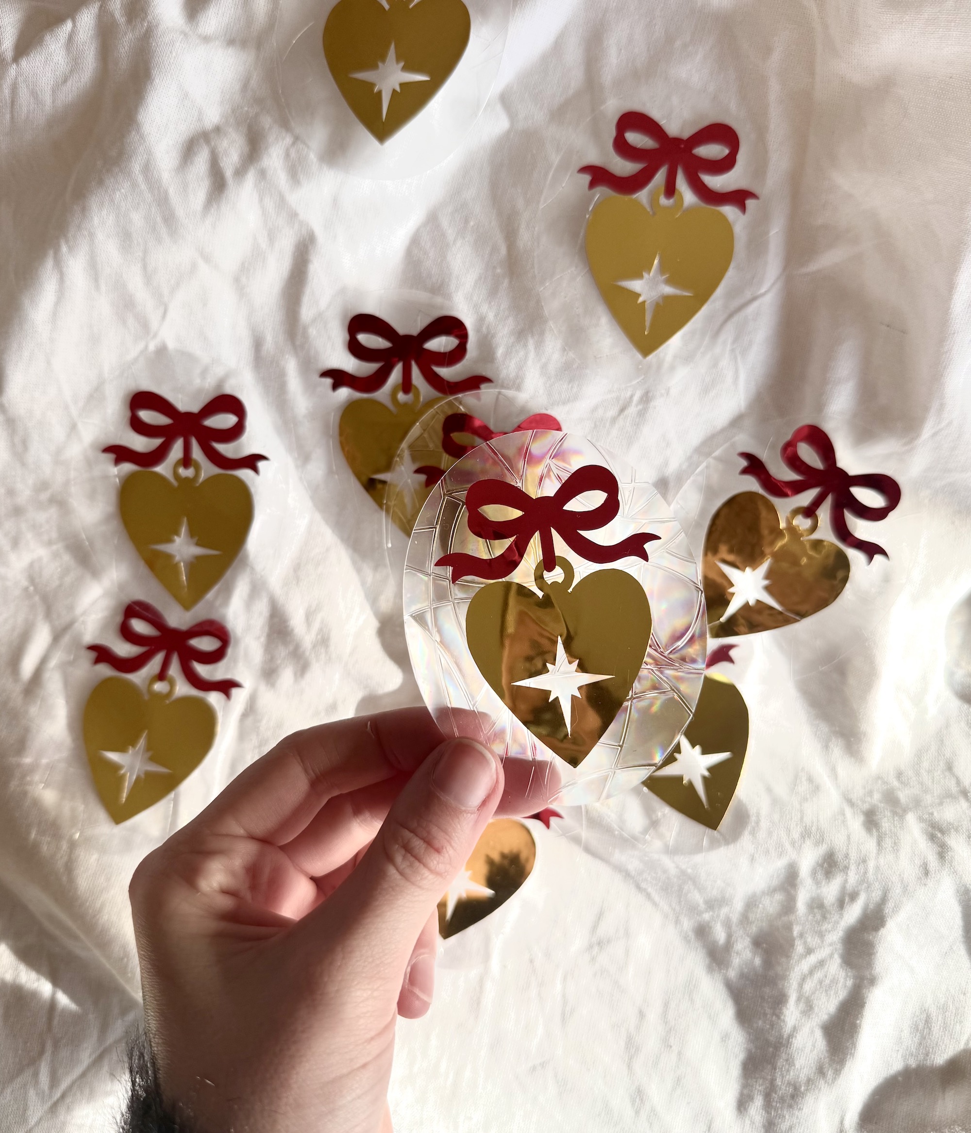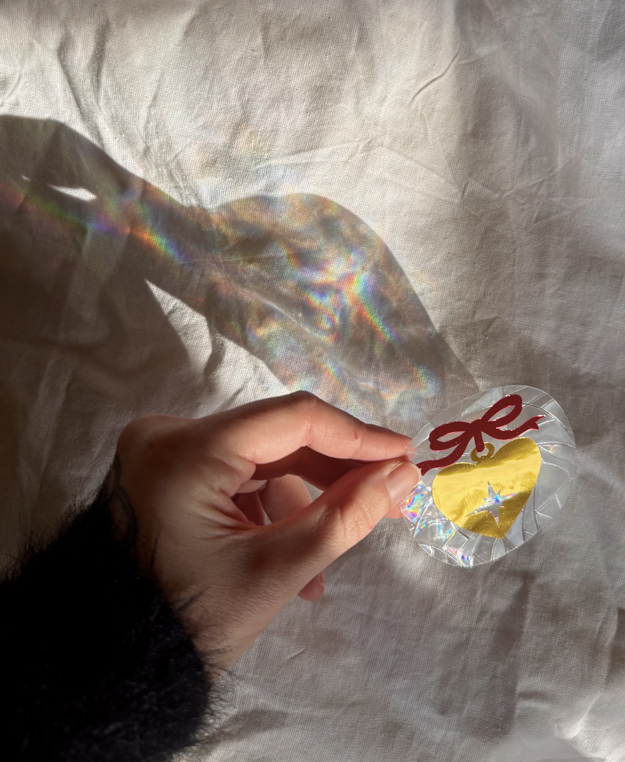 Découpé par mes soins dans un vinyle holographique diffractant or & rouge brillant, ce petit « attrape soleil «  cœur Sacré d’environ 8 cm de hauteur diffracte la lumière qui passe par vos fenêtres – projetant des rayons arc-en-ciel dans votre intérieur dès que le soleil apparaît.