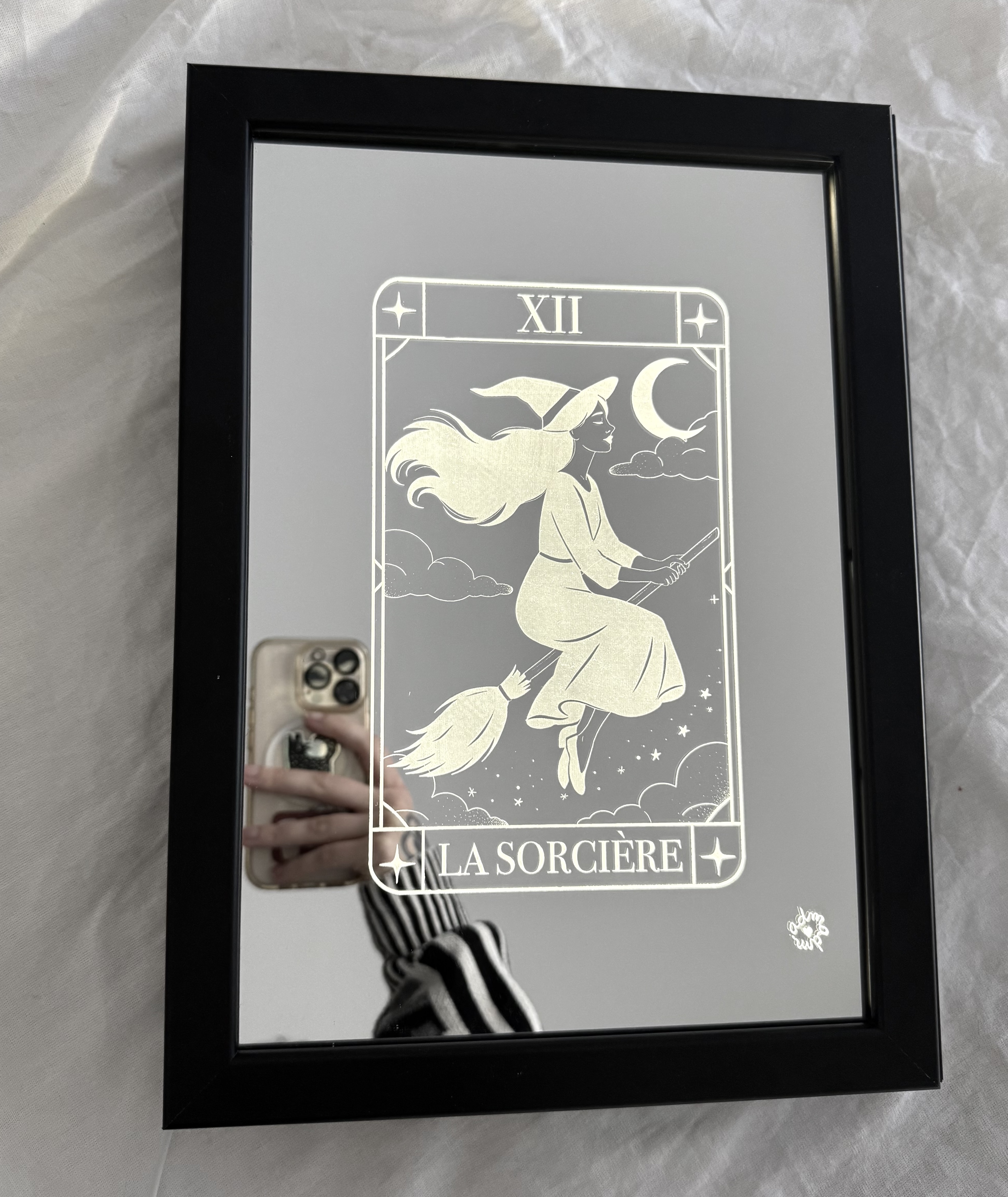 Les miroirs sont gravés par mes soins dans mon atelier,  à l’aide d’une machine laser.