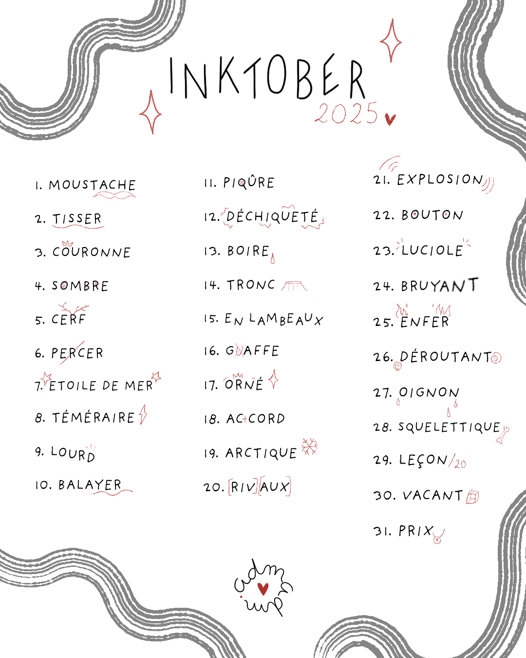 Mais d’abord c’est quoi l’inktober ? C’est un défi imaginé en 2009 par l’artiste américain Jake Parker : un mot par jour, tout le mois d’octobre, pour inviter chacun à créer autour de thème spécifiques !