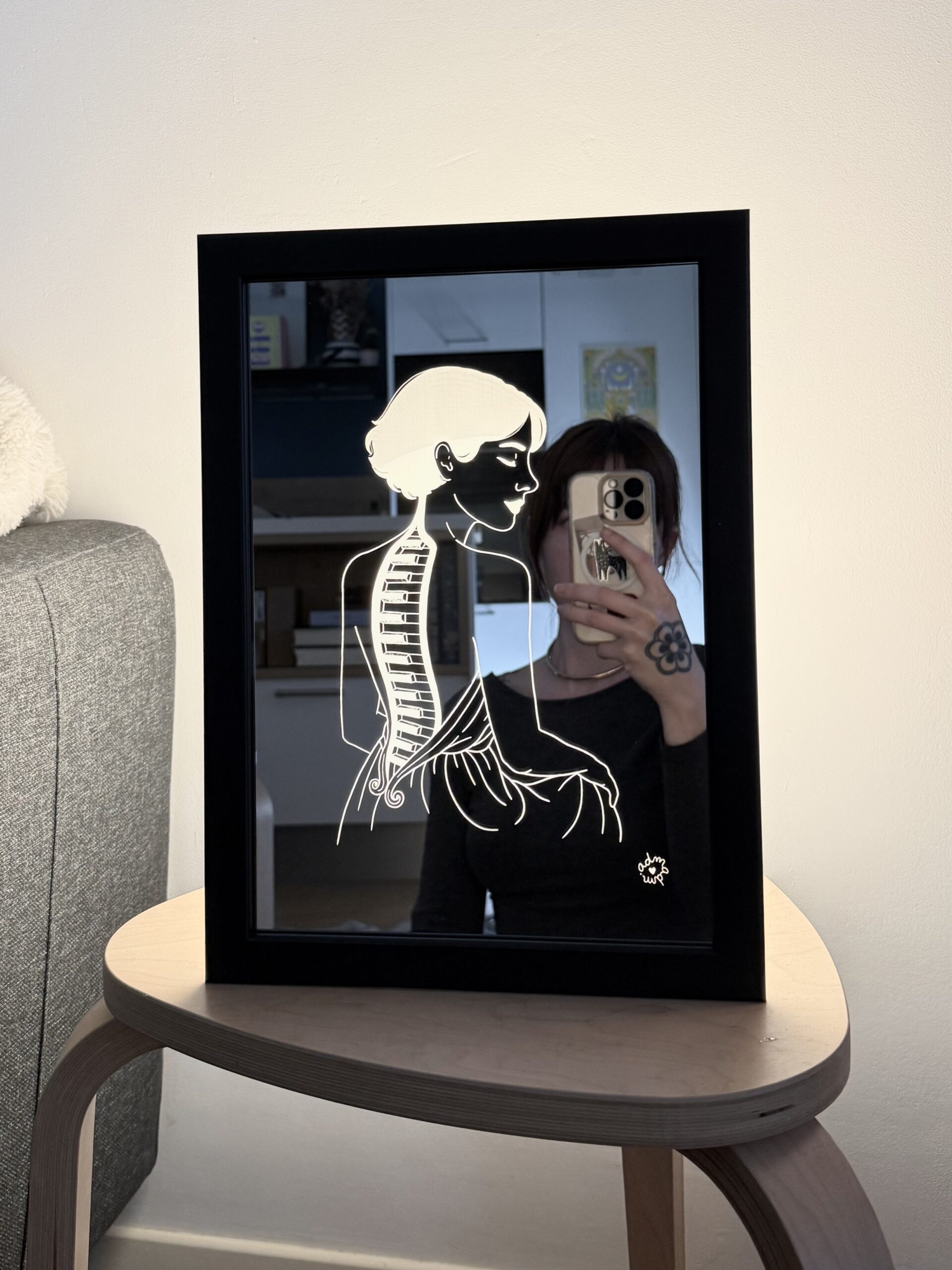 Pour révéler & éclairer le motif, placez le miroir dos ou contre une source lumineuse (ça marche avec le soleil !)  Il existe aussi des présentoir avec des socles led 🙂