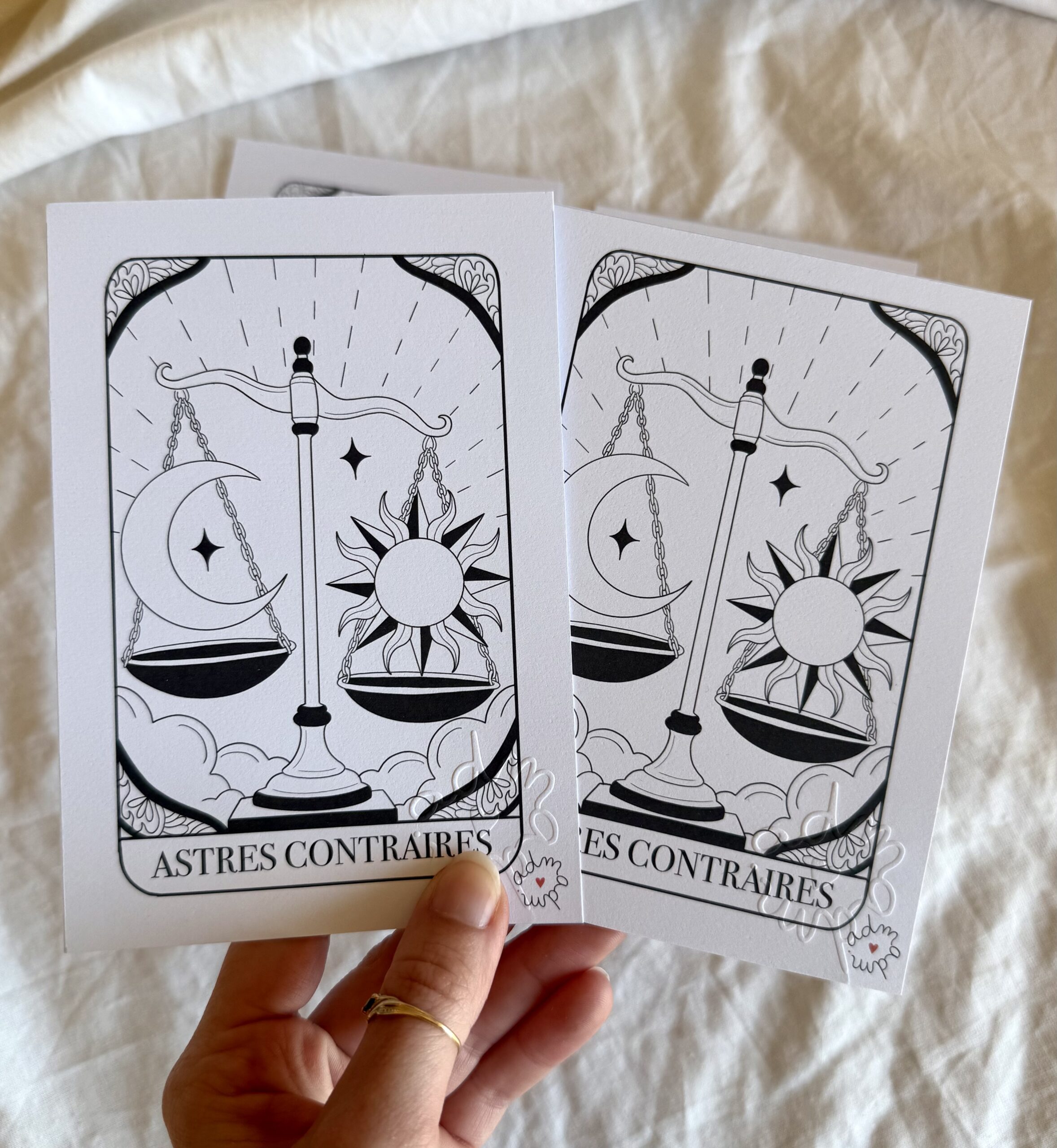 Vingtième jour  :   » Les astres contraires  »    : le Soleil, lumineux et aimé de tous, tire le ciel vers lui. La Lune, plus discrète et légère, s’en remet à la patience des étoiles. Cette carte enseigne que nul éclat ne brille sans son ombre.