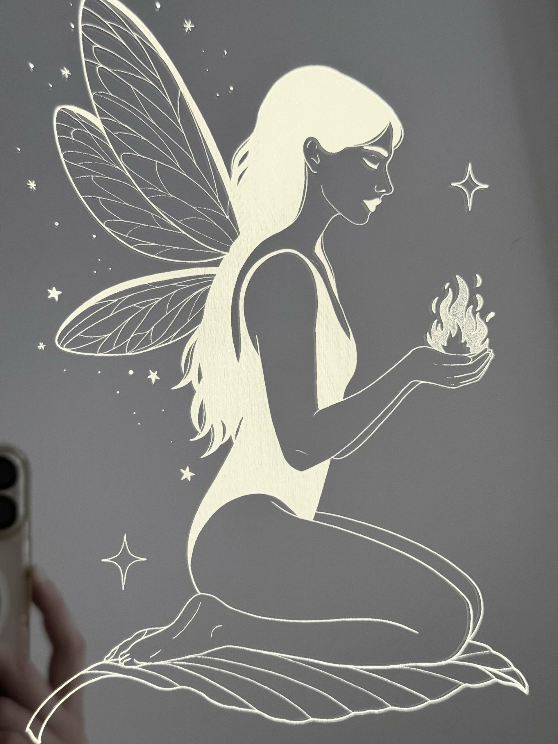 Vingt-troisième :  » La Veilleuse « .  Cette petite fée a toujours eu peur du noir, si bien que la Nuit lui offert le feu qu’elle veille chaque soir jusqu’à l’aube.