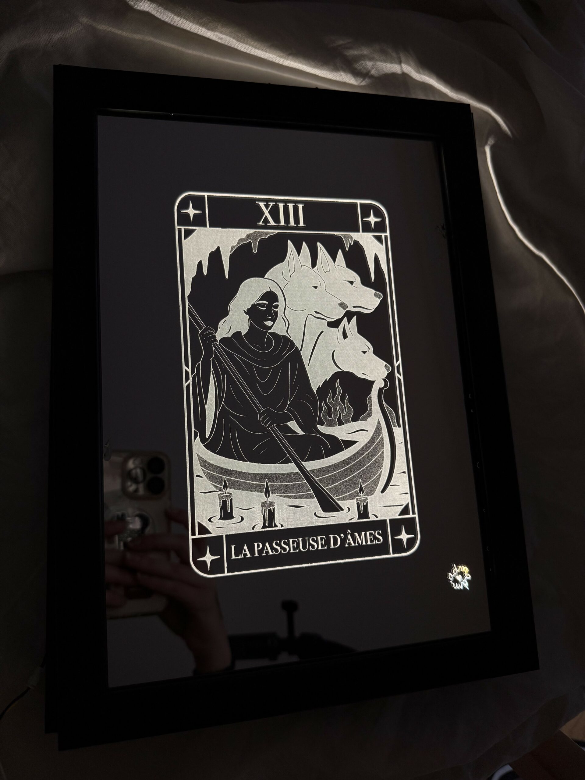 Pour révéler & éclairer le motif, placez le miroir dos ou contre une source lumineuse (ça marche avec le soleil !) Il existe aussi des présentoir avec des socles led 🙂