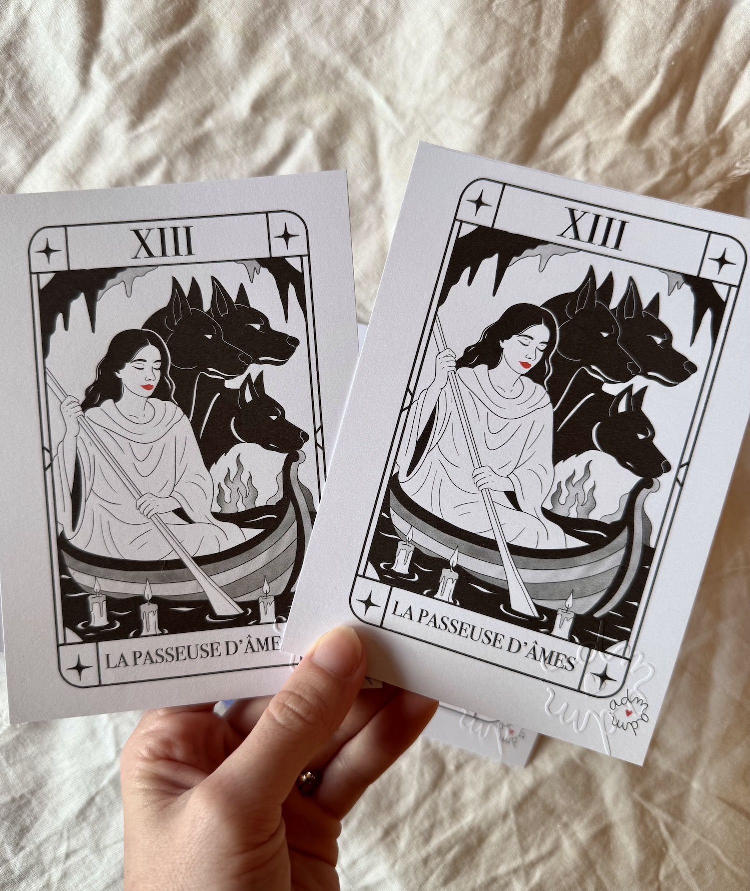 Vingt-cinquième jour : « La passeuse d’Ames », gardienne des Enfers, elle conduit les damnés le long du Styx. Née des nuits de Nyx, elle guide les âmes sans sépulture dans la noirceur des enfers.  Symbole de la transition, de la paix face à la fin, elle incarne la traversée silencieuse de tout ce qui doit mourir pour renaître.