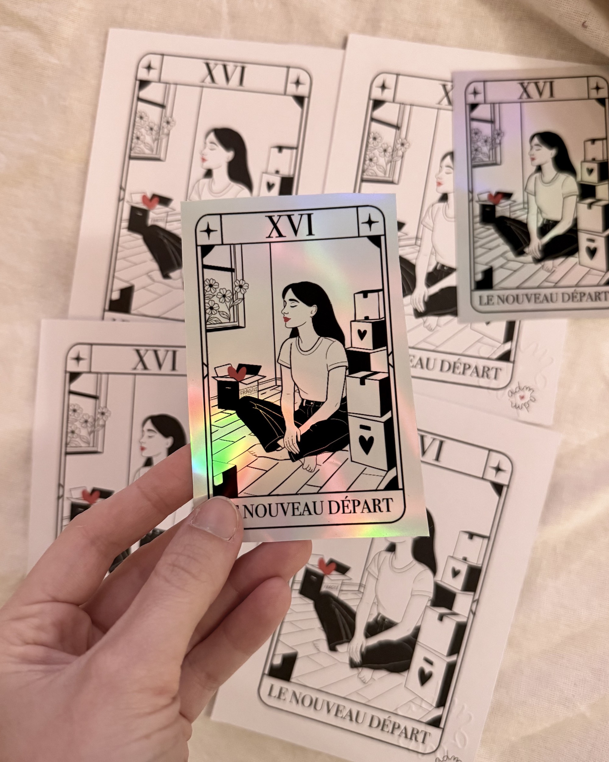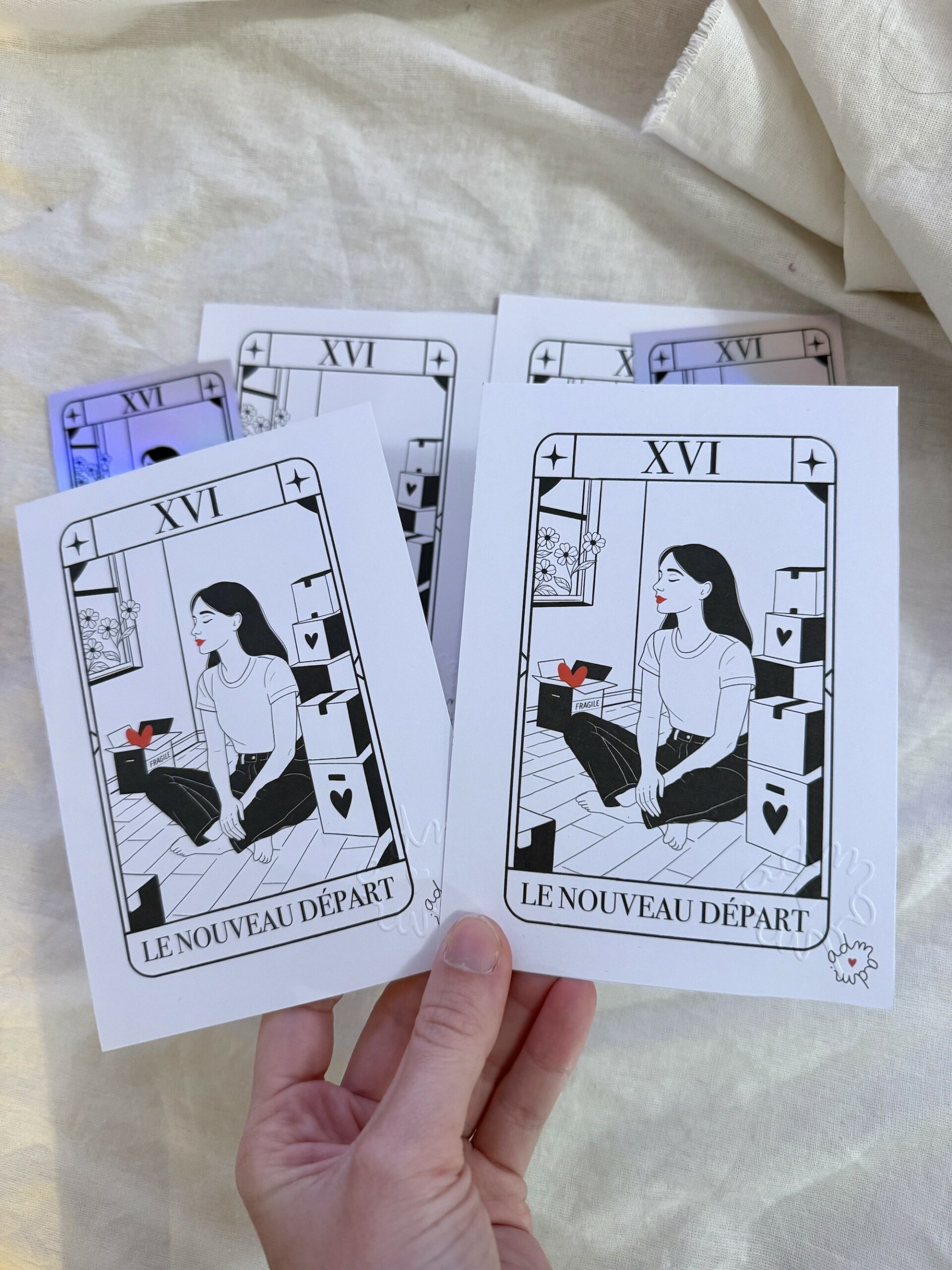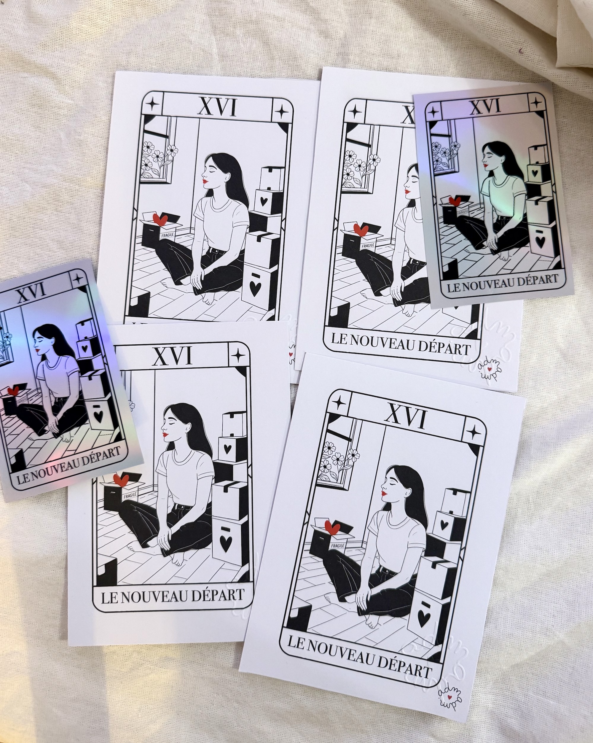 Trentième jour : « Le nouveau départ ». Suspendue entre deux vies: elle prend une pause. Au milieu d’elle survit des morceaux du passé, des bribes de ce qu’elle a été et décidé de conserver : ce fragment de coeur témoin d’un amour passionné qui s’est consumé, cette photo vieillie vestige d’une famille aimante, ce livre corné -lu et relu- qui semble avoir été écrit pour elle… Cette carte symbolise la transition, ce temps suspendu entre passé et renouveau, propice à l’introspection.