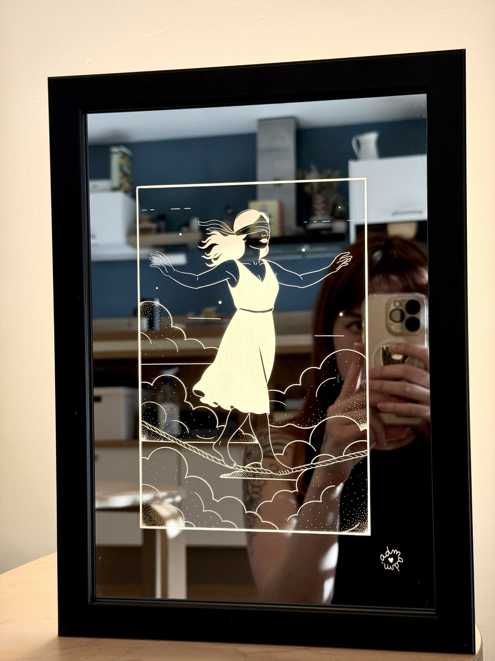 Les miroirs sont gravés par mes soins dans mon atelier,  à l’aide d’une machine laser.