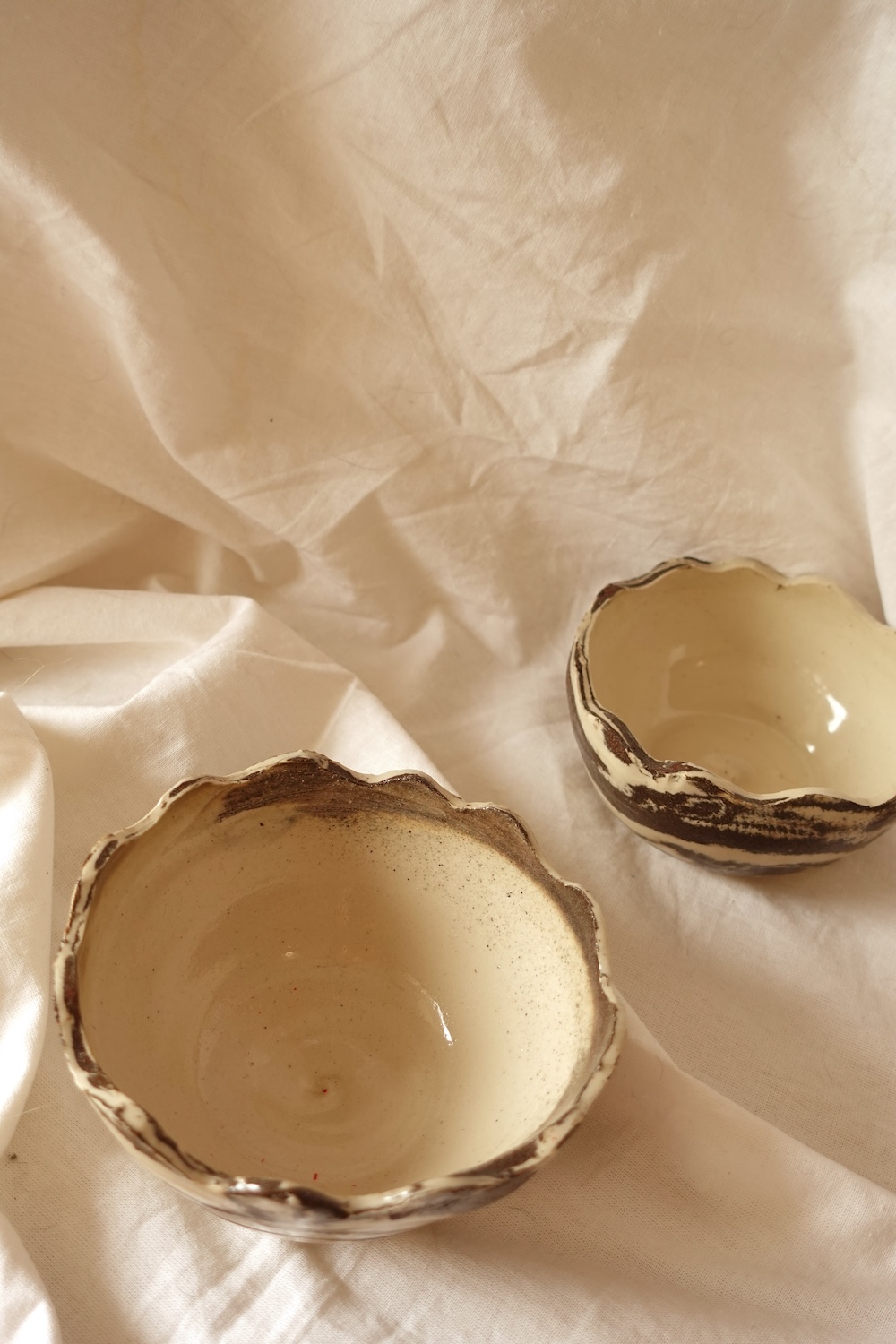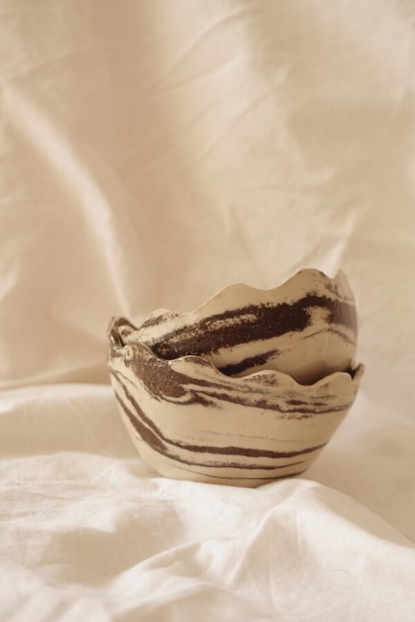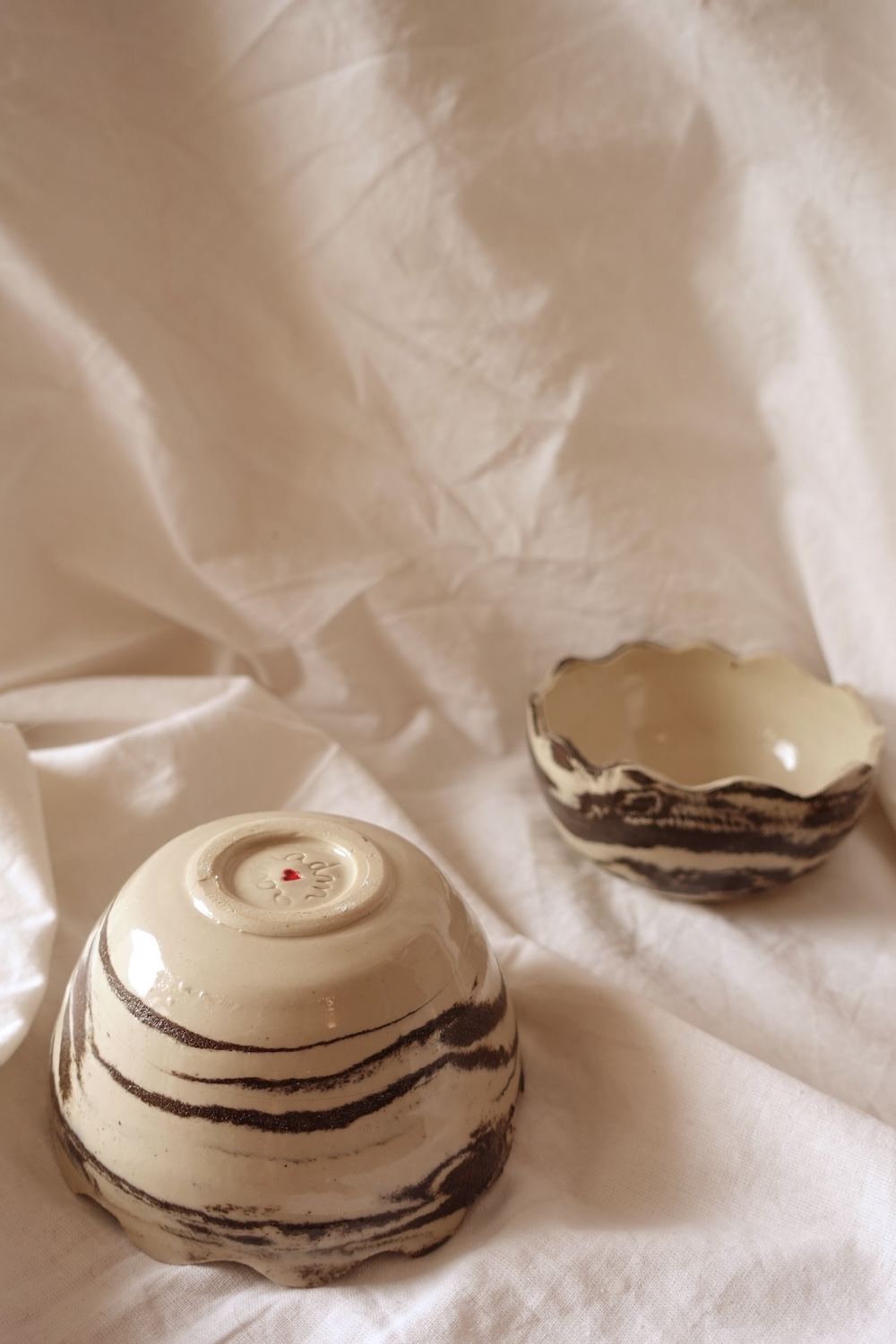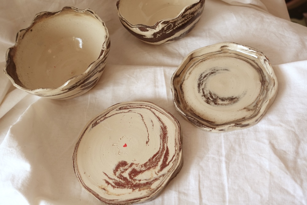 Les terres sont mélangées à la main, à la première étape du tournage : le mouvement du tour vient ensuite creer naturellement des motifs marbrés en spirale, totalement aléatoires. Chaque pièce présente donc un dessin unique, directement lié au geste et à la rotation.