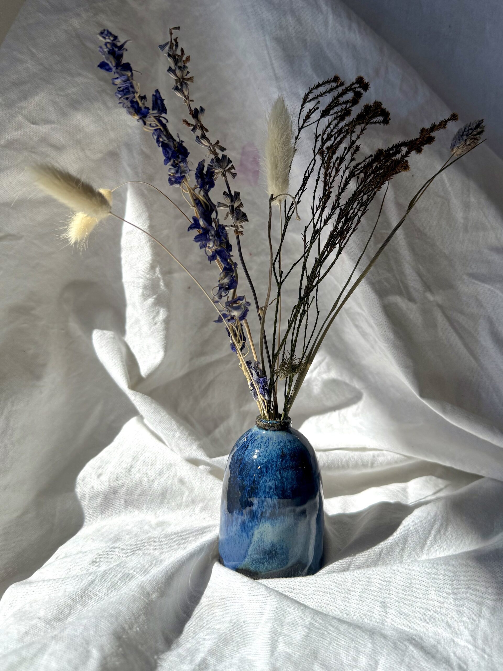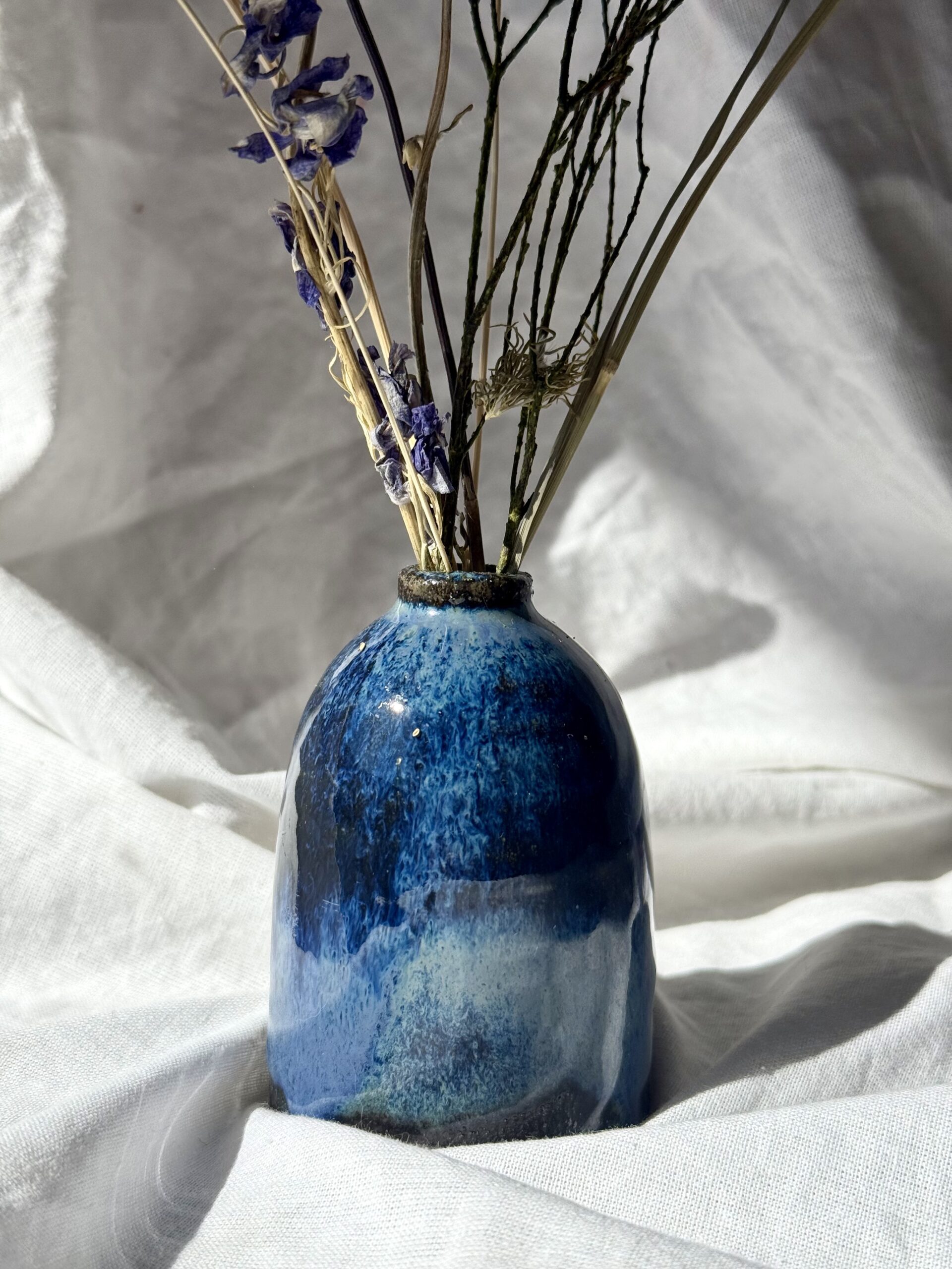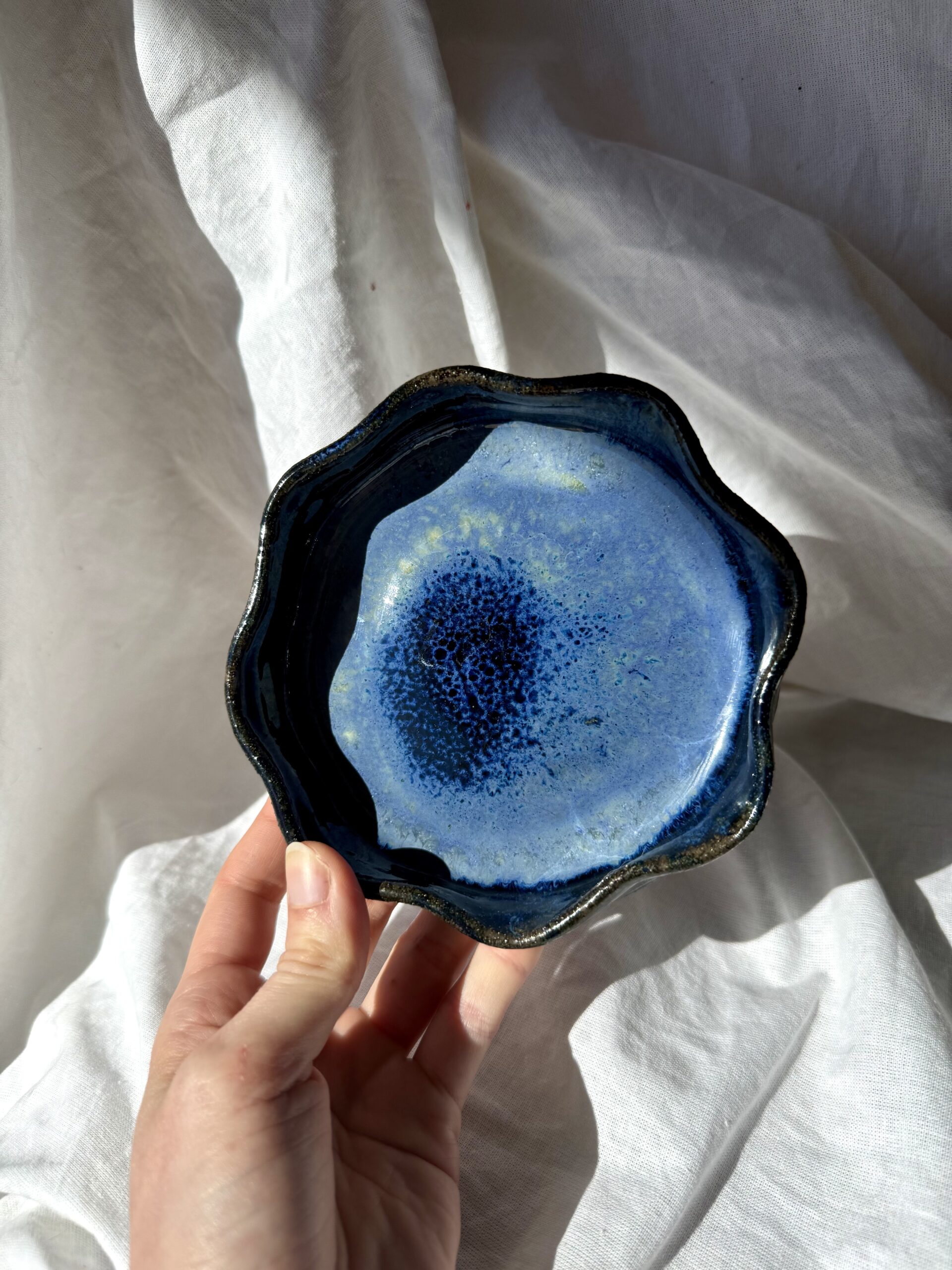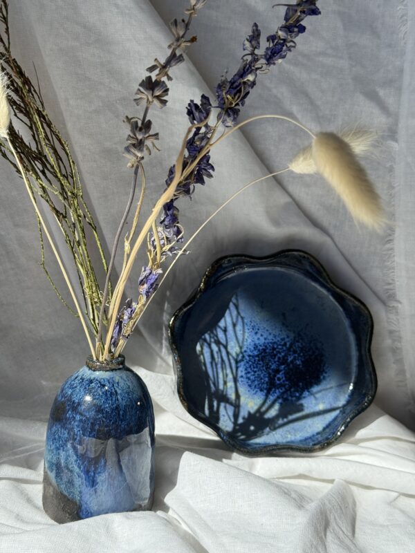 Chaque pièce naît d’un processus entièrement artisanal : de la terre brute, elle est d’abord tournée, puis laissée à sécher à l’air libre quelques jours avant d’être tournassée – c’est-à-dire affiner, retravailler… Après une première cuisson à 950°C, vient le moment de l’émaillage. Ici, j’ai superposé plusieurs émaux bleus & verts. À 2eme cuisson, ils se mélangent et réagissent entre eux, créant des dégradés, des zones mouchetées, des coulures imprévisibles. C’est toujours une surprise lorsque je découvre ma pièce à la fin – et ça la rend surtout unique !