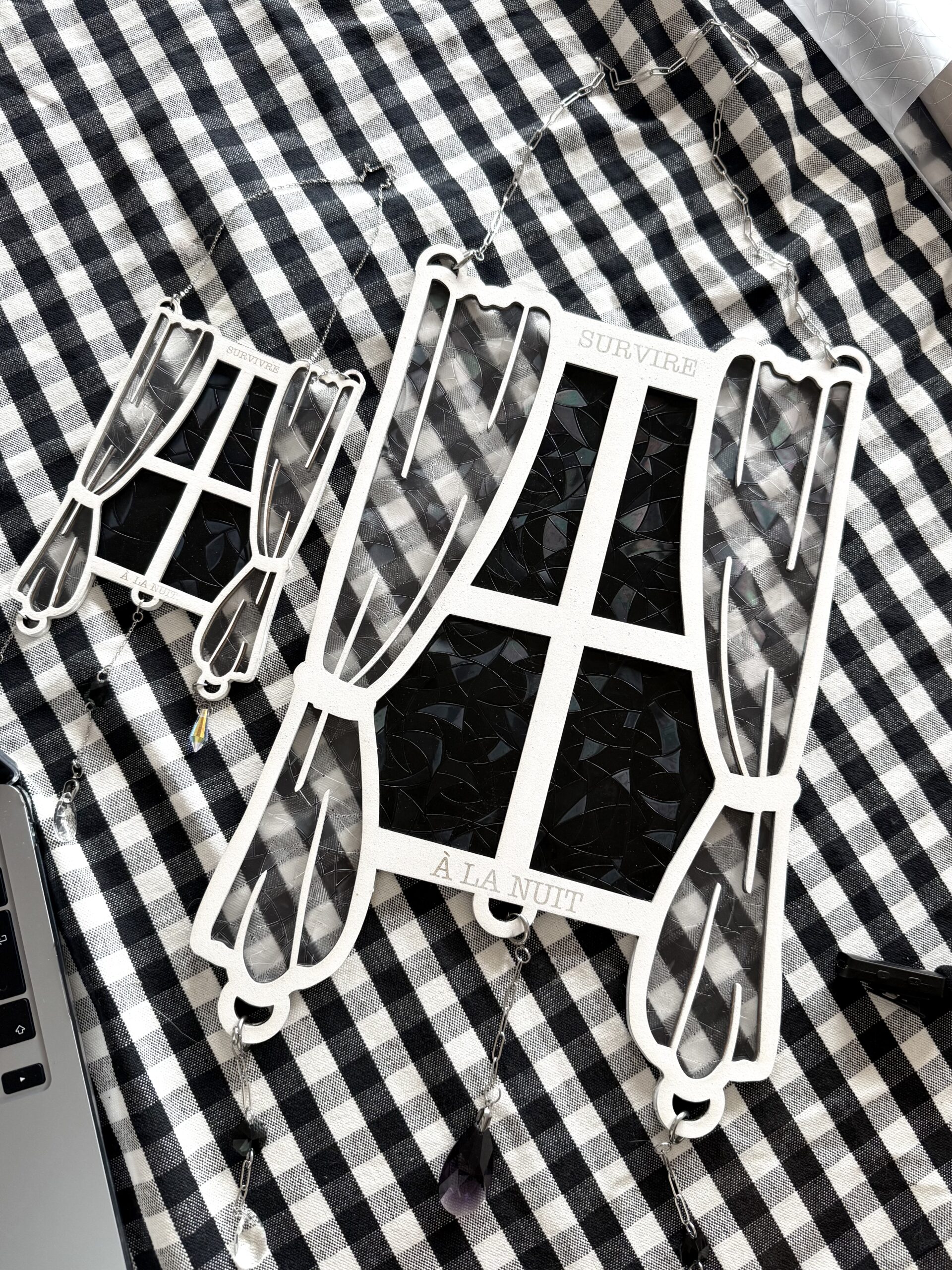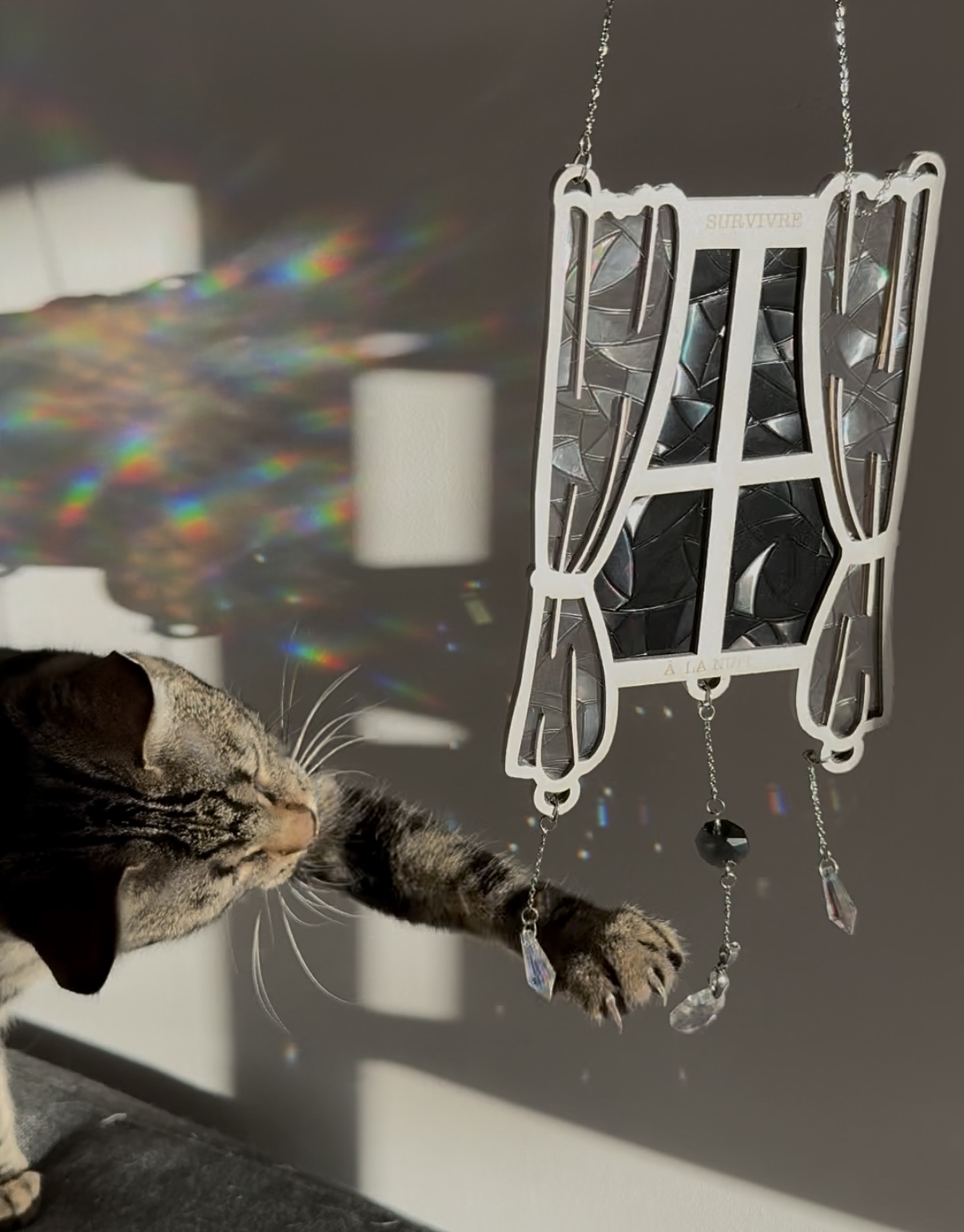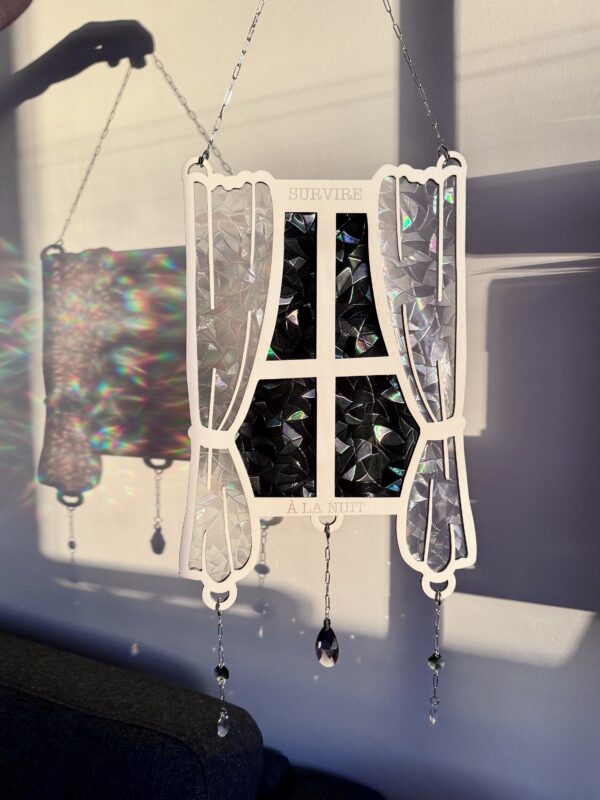 Chaque fenêtre est découpée dans des planches de bois de tilleul, que je viens ensuite peindre une à une & graver. En son cœur, je place deux films suncatcher diffractants : à l’ombre, ils semblent presque invisibles mais dès que le soleil les traverse, ils décomposent la lumière en fragments d’arc-en-ciel 🌈