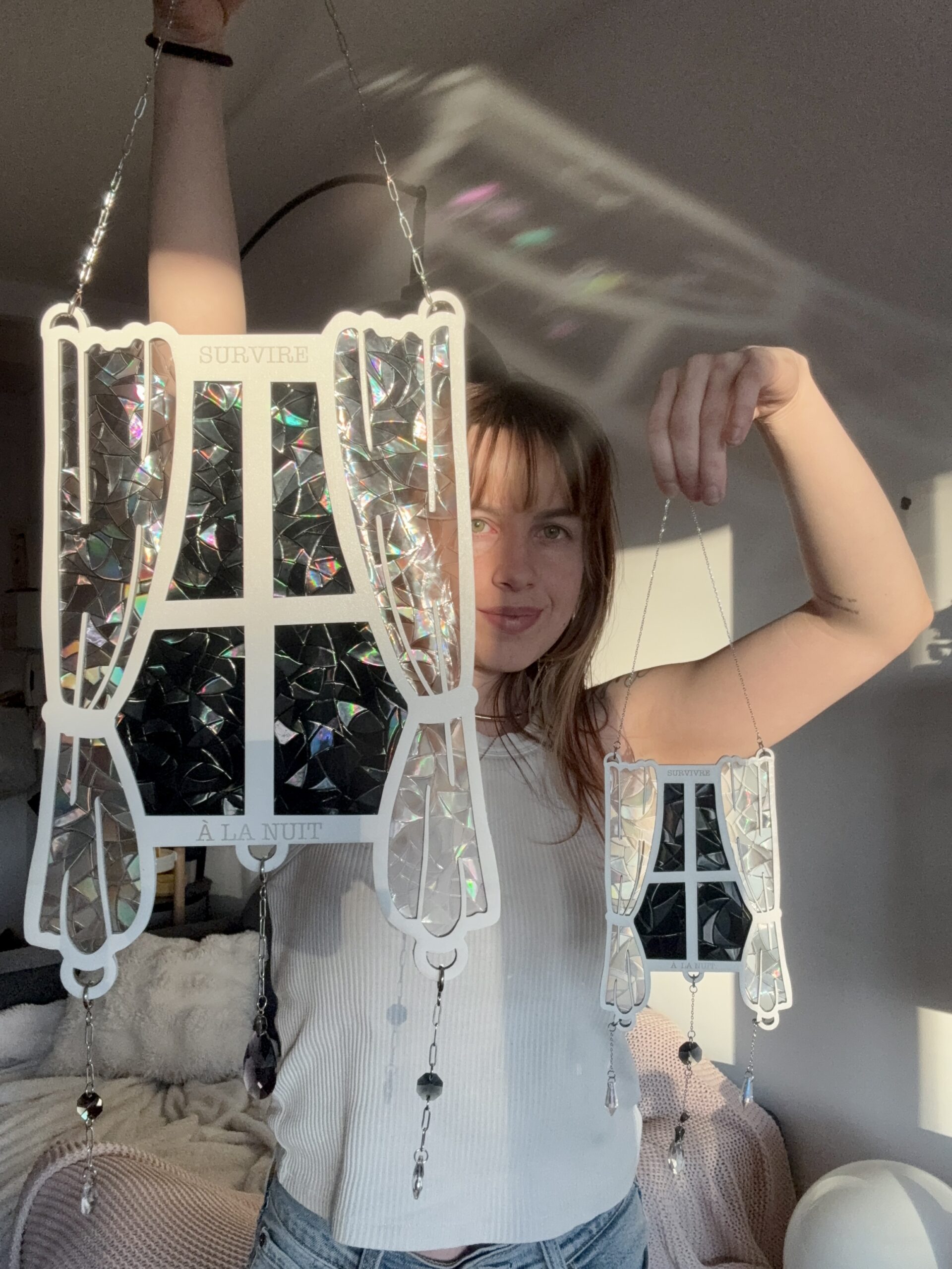Une fois la structure assemblée, je viens y accrocher plusieurs cristaux qui eux aussi captent la lumière et la dispersent dans la pièce, en projetant sur les murs des éclats semblables à ceux d’une boule à facettes.
