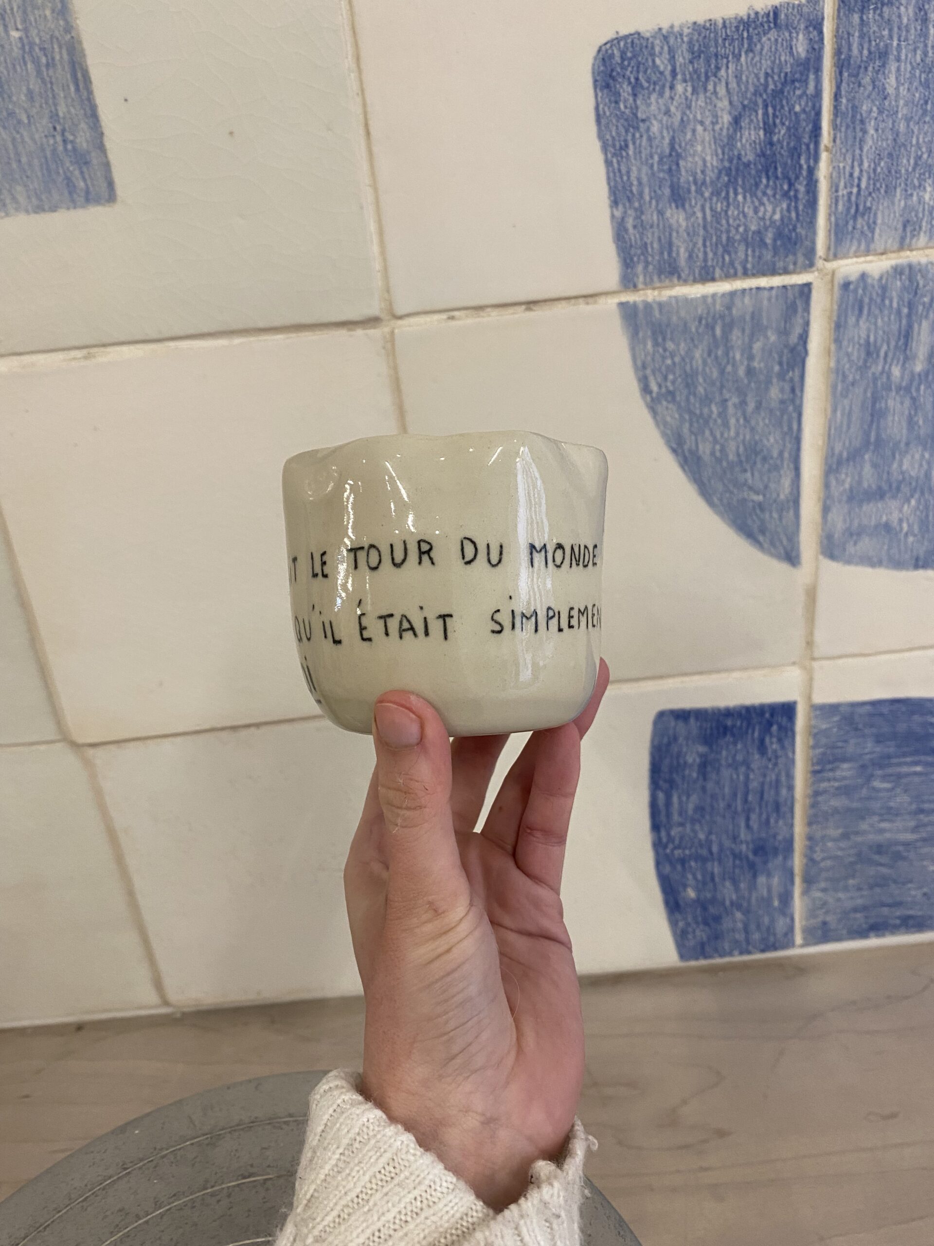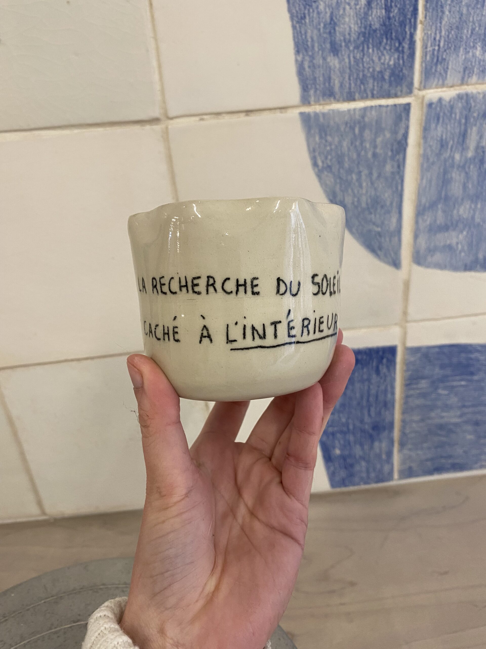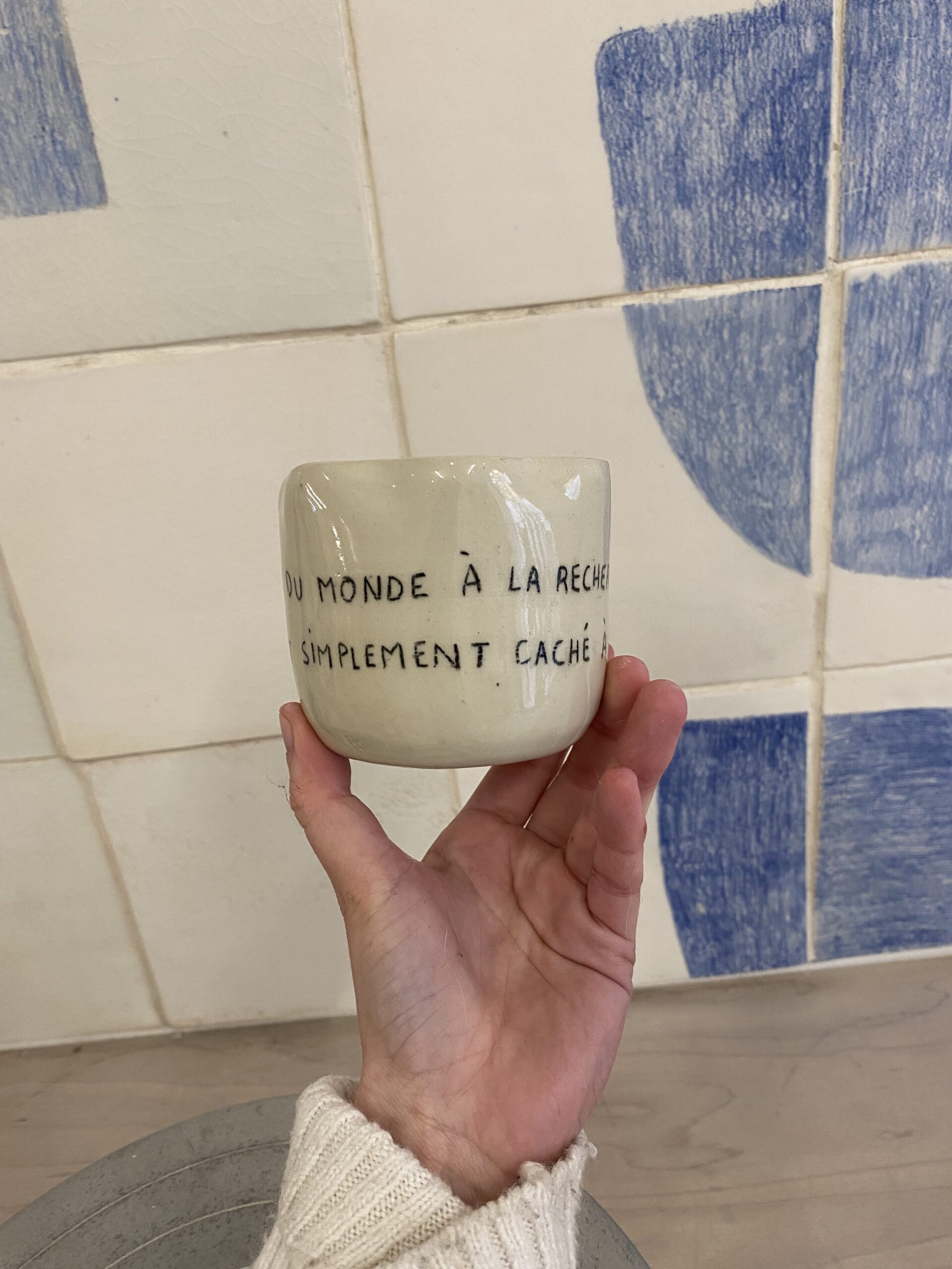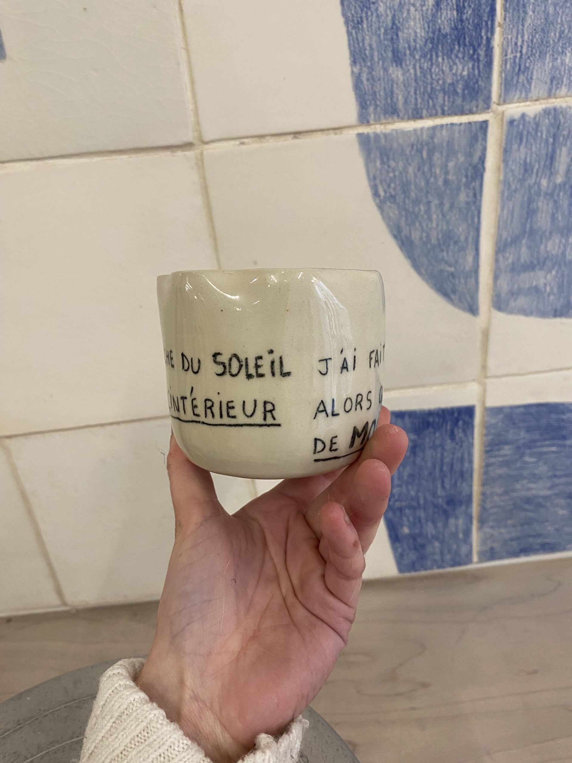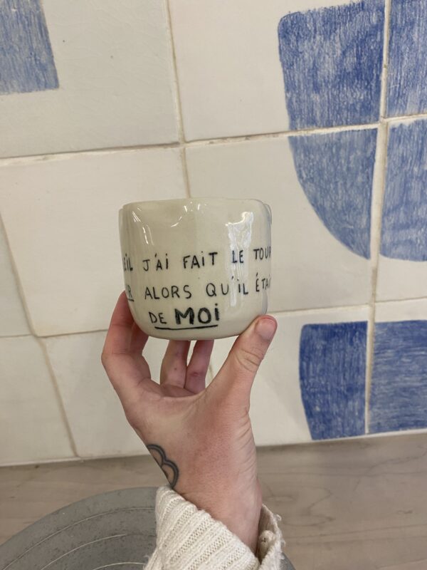 Tournées, décorée – le texte est écrit à la main au crayon à oxyde noir – puis émaillées par mes soins avec un émail transparent qui vient figer les mots dans la matière.