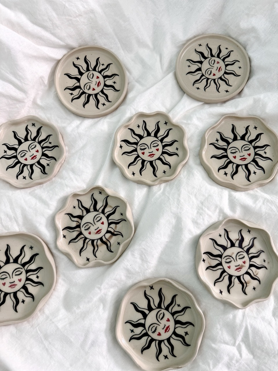 Chaque coupelle est faite à partir de grés blanc lisse, d’abord tournée brute et séchée à l’air libre quelques jours. Elle est ensuite tournassée, c’est-à-dire que je viens l’affiner, corriger la forme et le galbe pour mettre en valeur les détails. Après une première cuisson (950 degrés), je viens la décorer de mon motif soleil, peint à la main avec des sous glaçures noires et rouges.